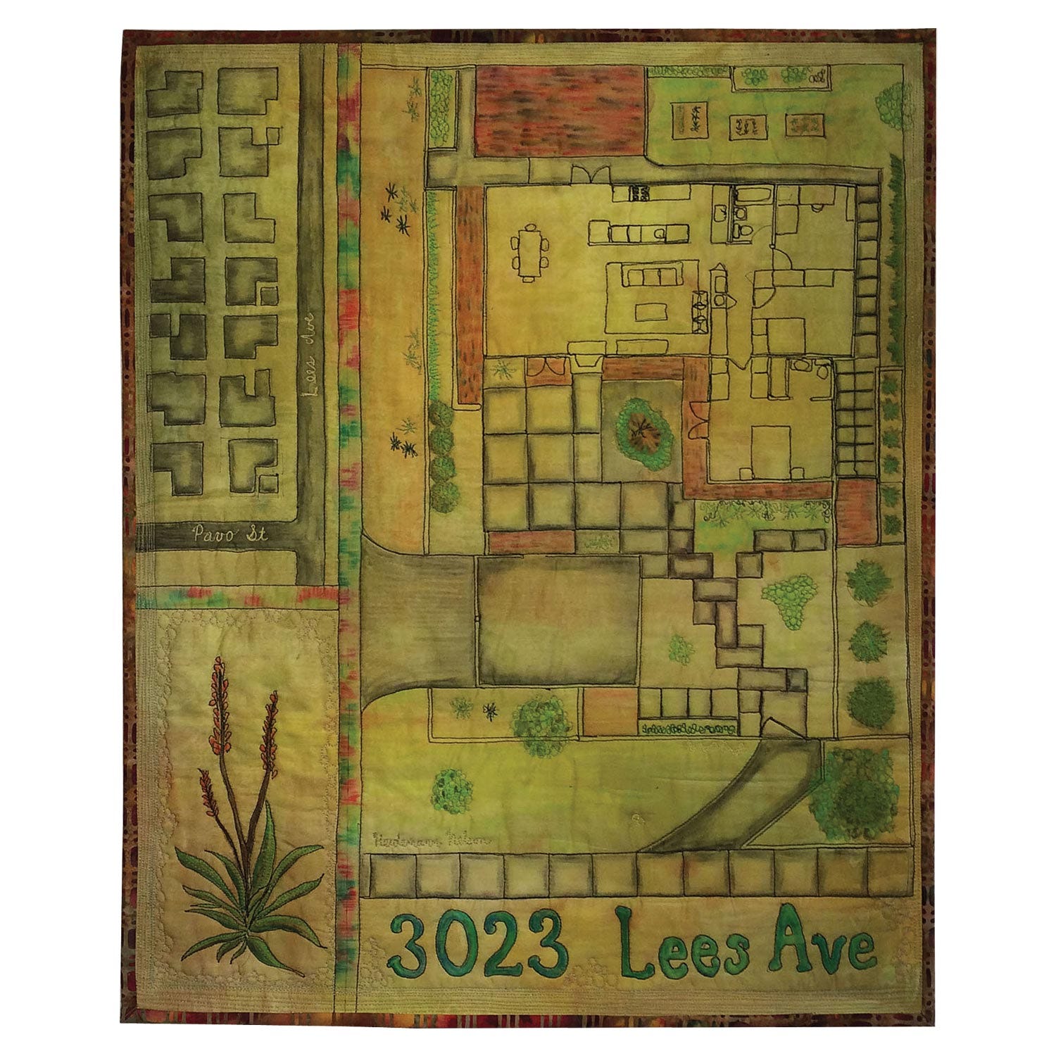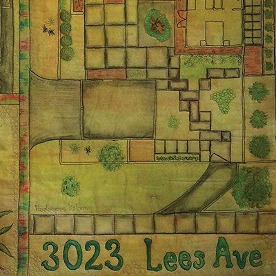 Maker: Dorothy Heidemann-Nelson, Lincoln, Neb.We who live in the Midwest are used to having a lot of space around us. It’s not that way in parts of our country. The plot plan of my son’s home is typical of the much more dense housing developments in California where every inch of space is utilized. I chose to capture this intense feeling by re-creating a plot plan of his property on a wholecloth art quilt using only quilting and color added to the surface of the single piece of painted fabric.