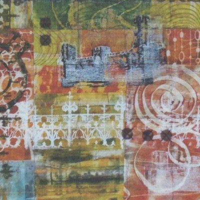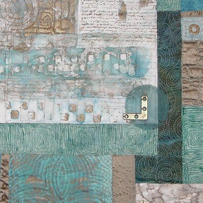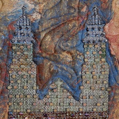 Materials/Techniques: First I painted mono-printed and stamped fabrics to combine with silk and commercial fabrics. Then I collaged the parts in a very linear fashion to imply a built structure. Then I used stitching to add texture and emphasize the elements of stucco, stone and column details. I added beads and washers to imply the hardware which holds some of the parts together.