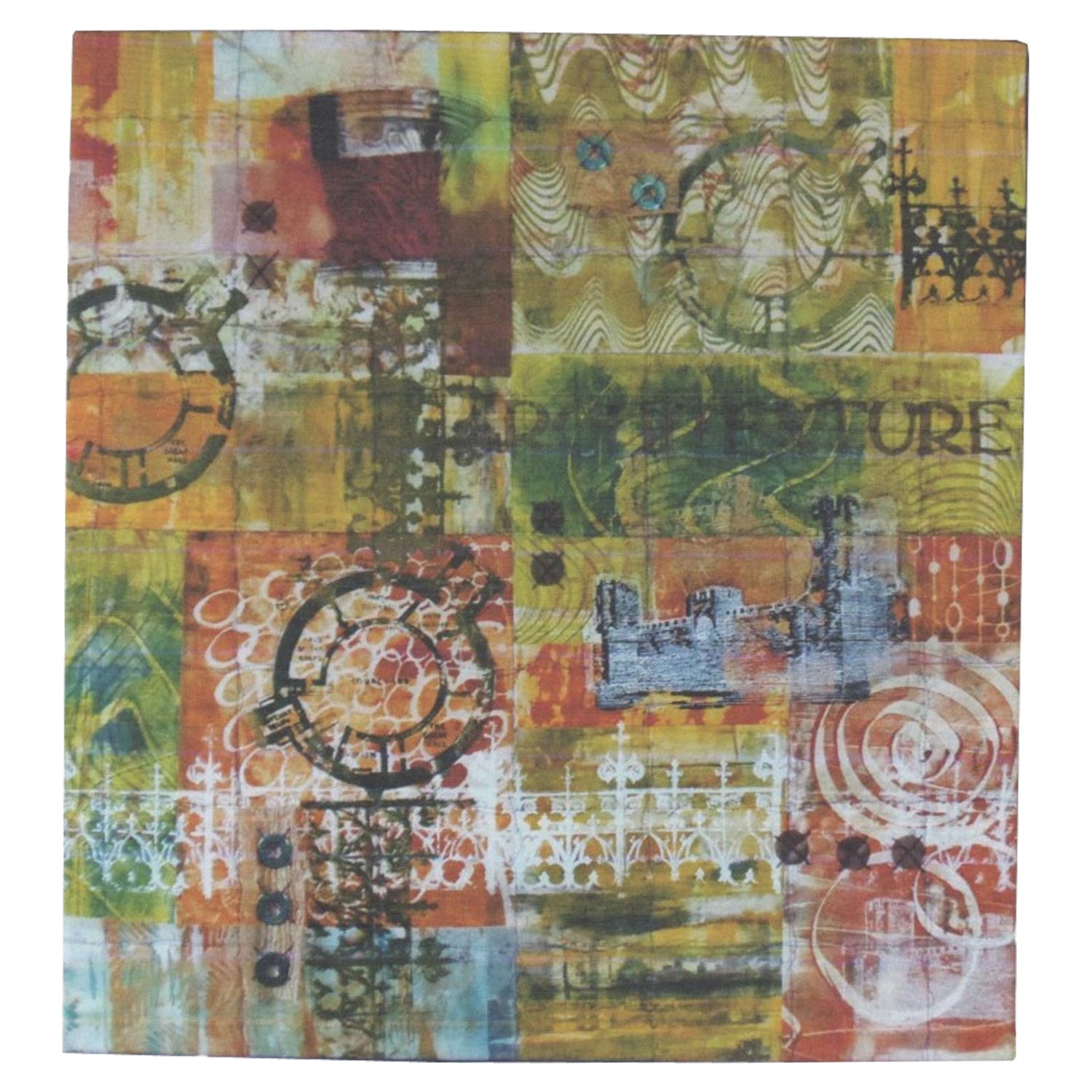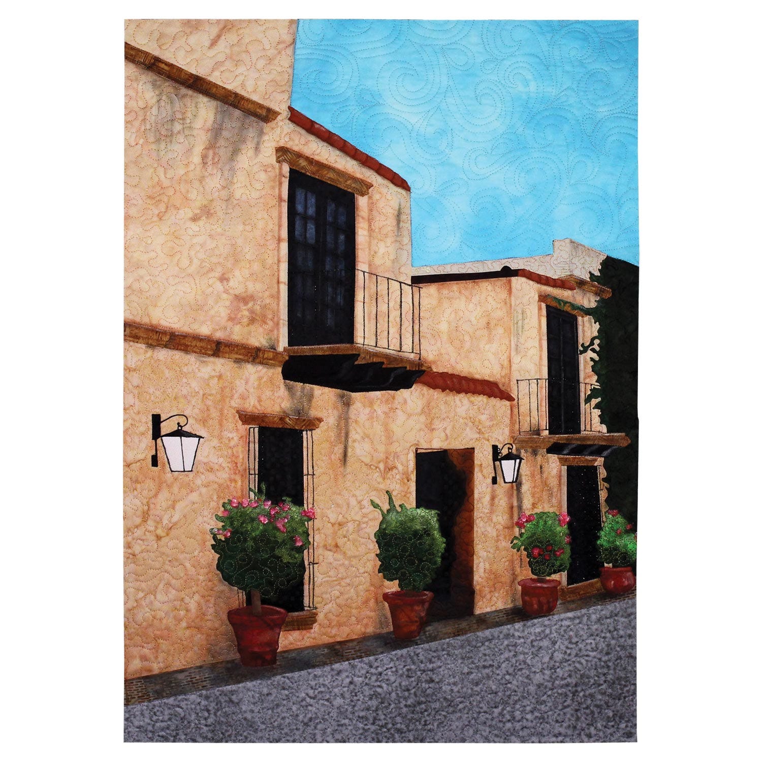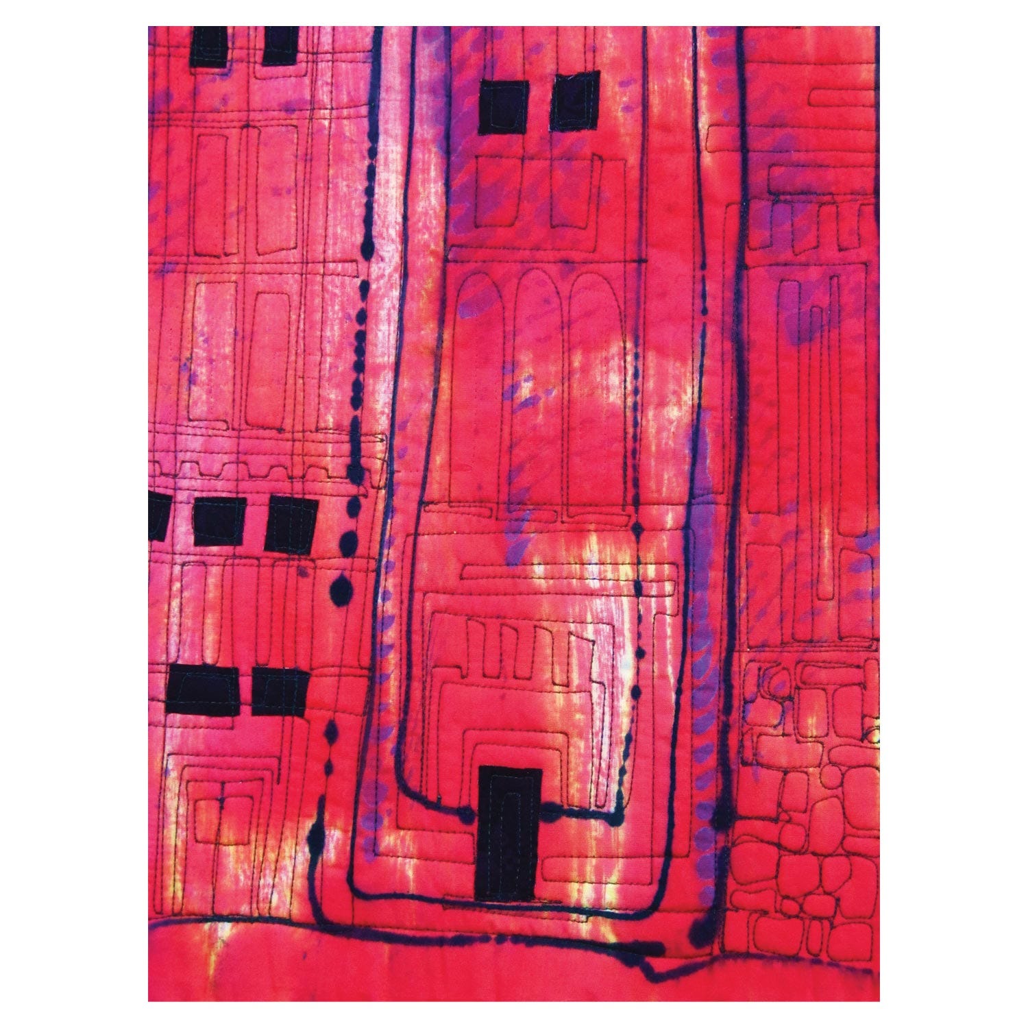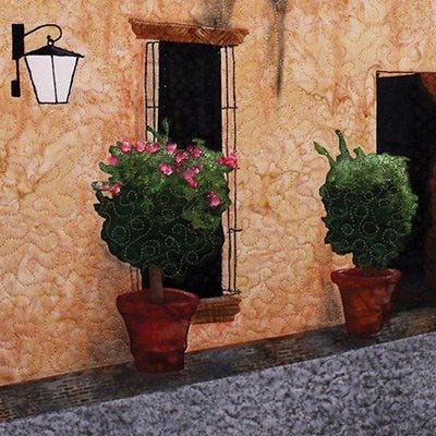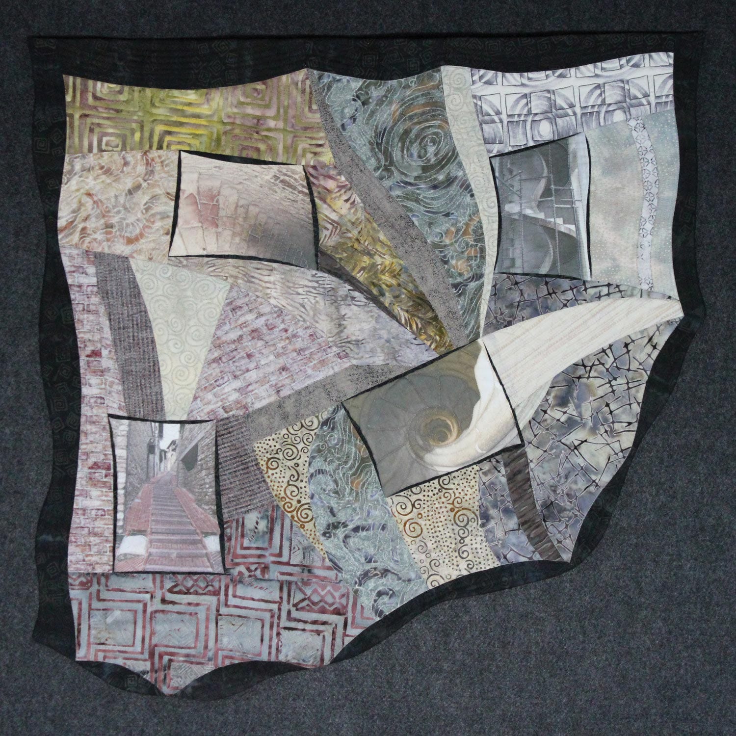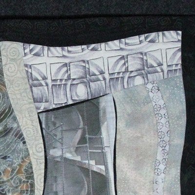Structures have a foundation and a variety of materials that fit together for strength and stability. Like building a structure, I intuitively collaged hand-painted fabrics, silk and a few commercial fabrics to create rhythm and balance with line and form, light and dark and scale. I incorporated elements that mimic stucco, stone and other building materials as well as decorative motifs that might be used for details to add interest to a structure.