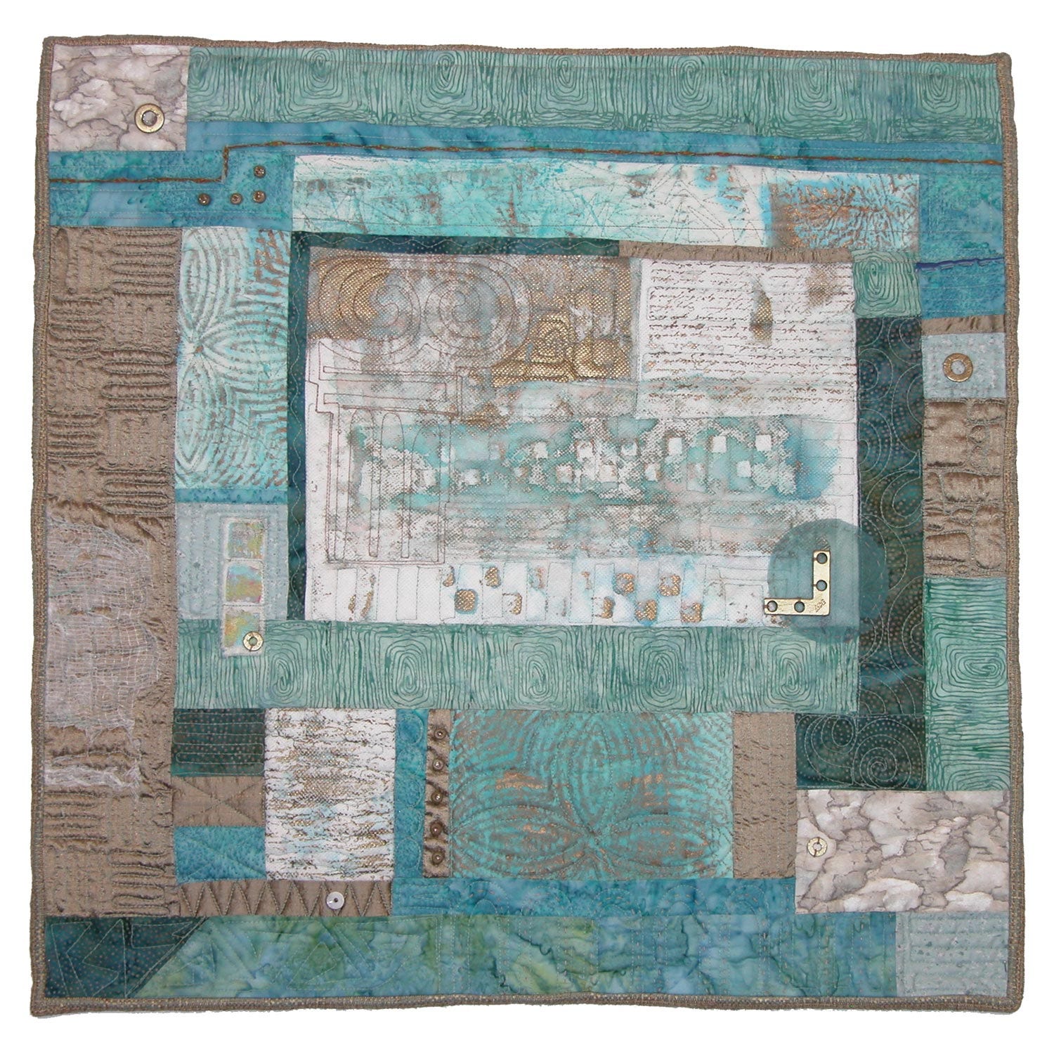 Materials/Techniques: I hand dyed and painted the background and rectangles which lent themselves well to the theme. The piece was quilted by fellow SAQA member, Aimee Mahan.