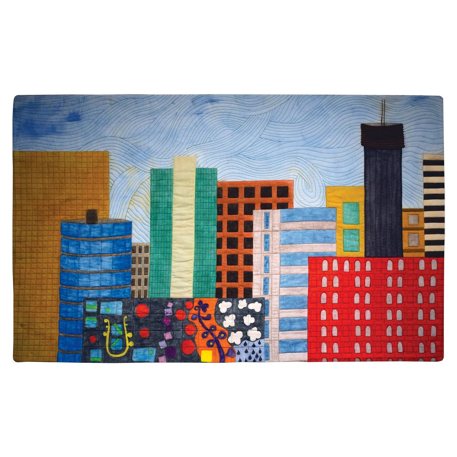 Materials/Techniques: In “City Scape 2”, I started with a whole cloth and painted the buildings using inktense and watercolour pencils. The sky was colored using diluted dye-n-flow. Machine quilted.