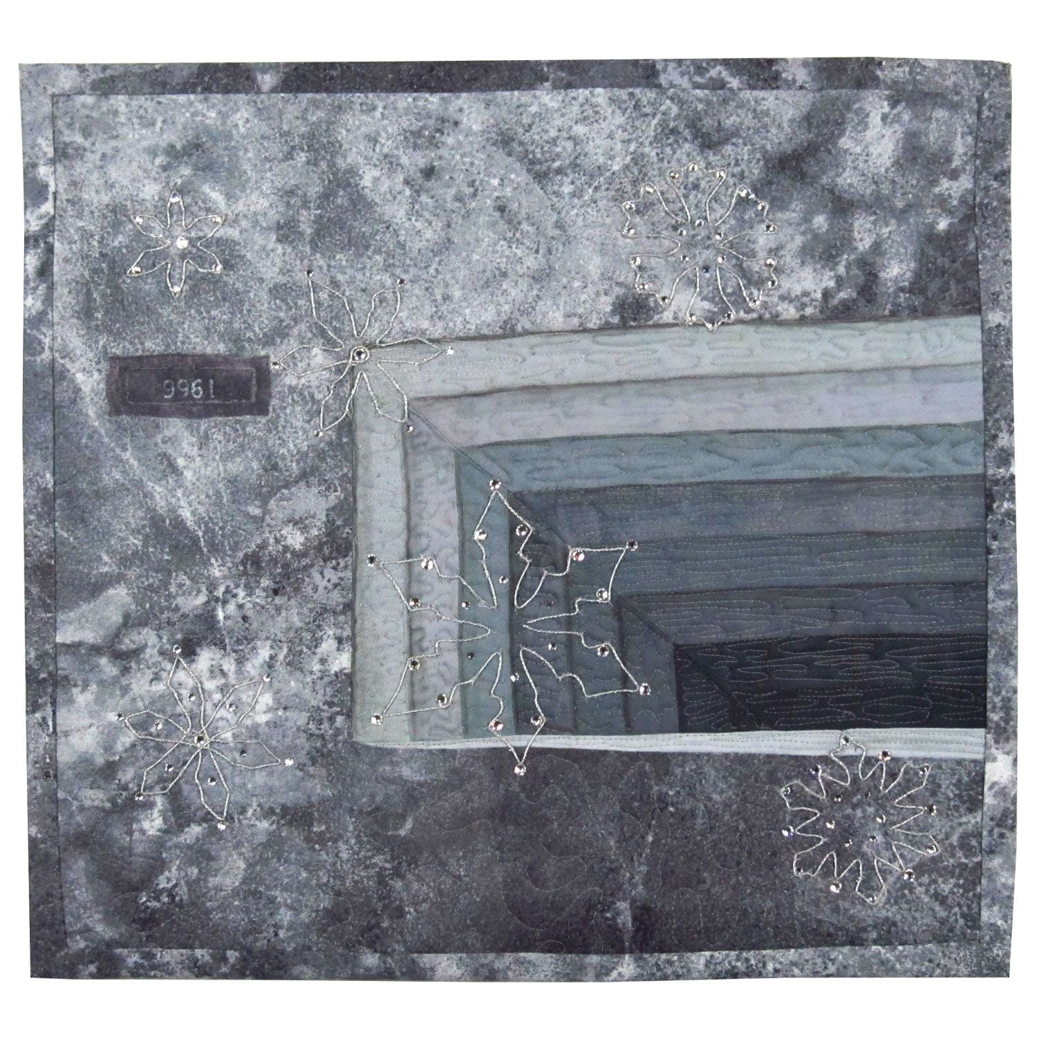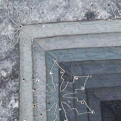 Materials/Techniques: Machine piecing, machine quilting, bobbin threadwork, artist transfer paper, crystal applied with heat, binding as part of backing cover.