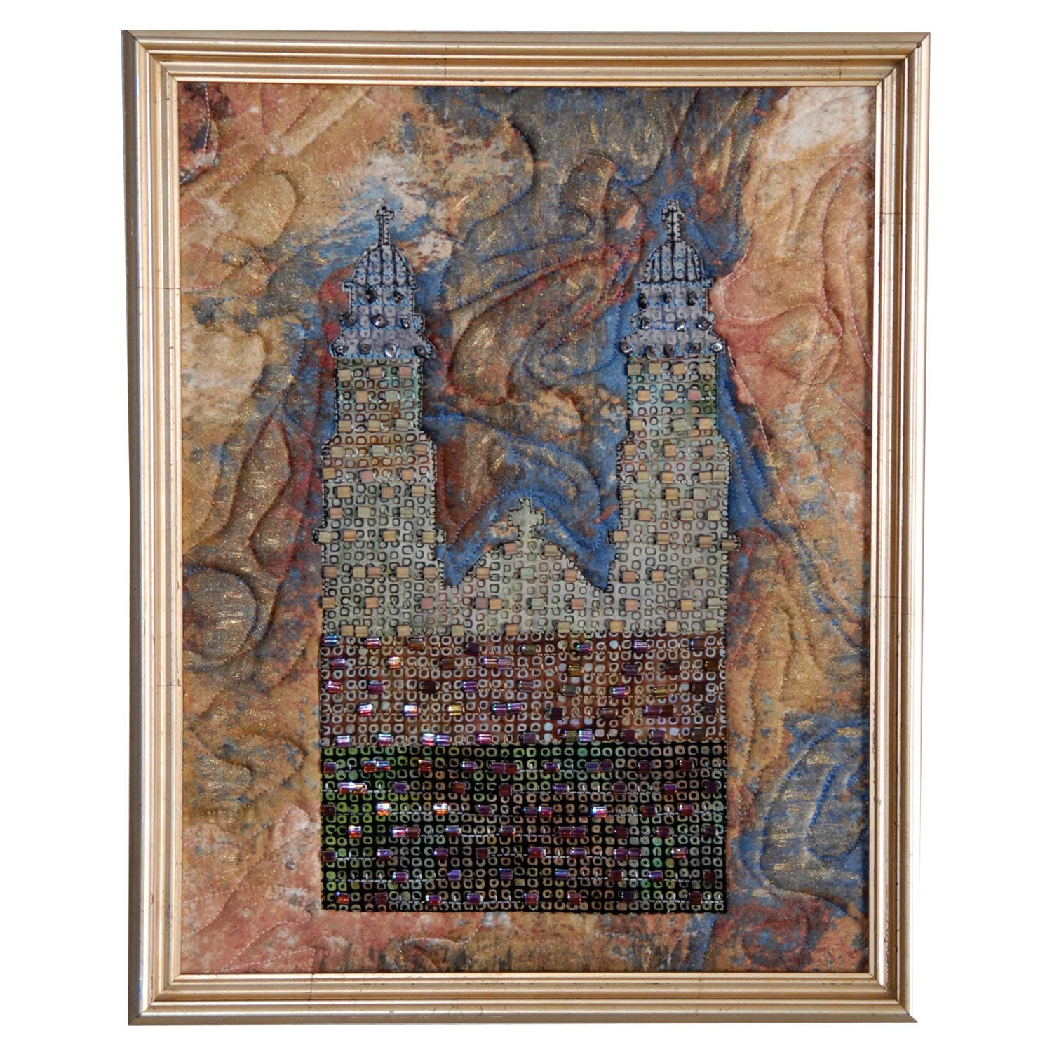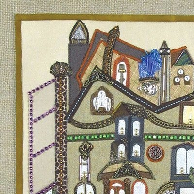 Elaine created a drawing of a whimsical house, transferred it to cotton fabric and embellished it with a variety of beads, threads, pieces of jewelry, trims, buttons and stitching. The clear plastic on the left side represents a glass elevator. Each window has lighted candles to invite visitors in Old World style. The “house” piece is bound with hand dyed fabric and mounted on a burlap matt background bound with dupioni silk.