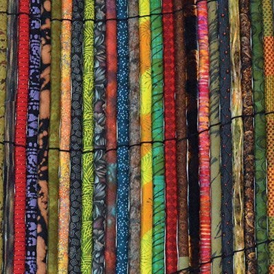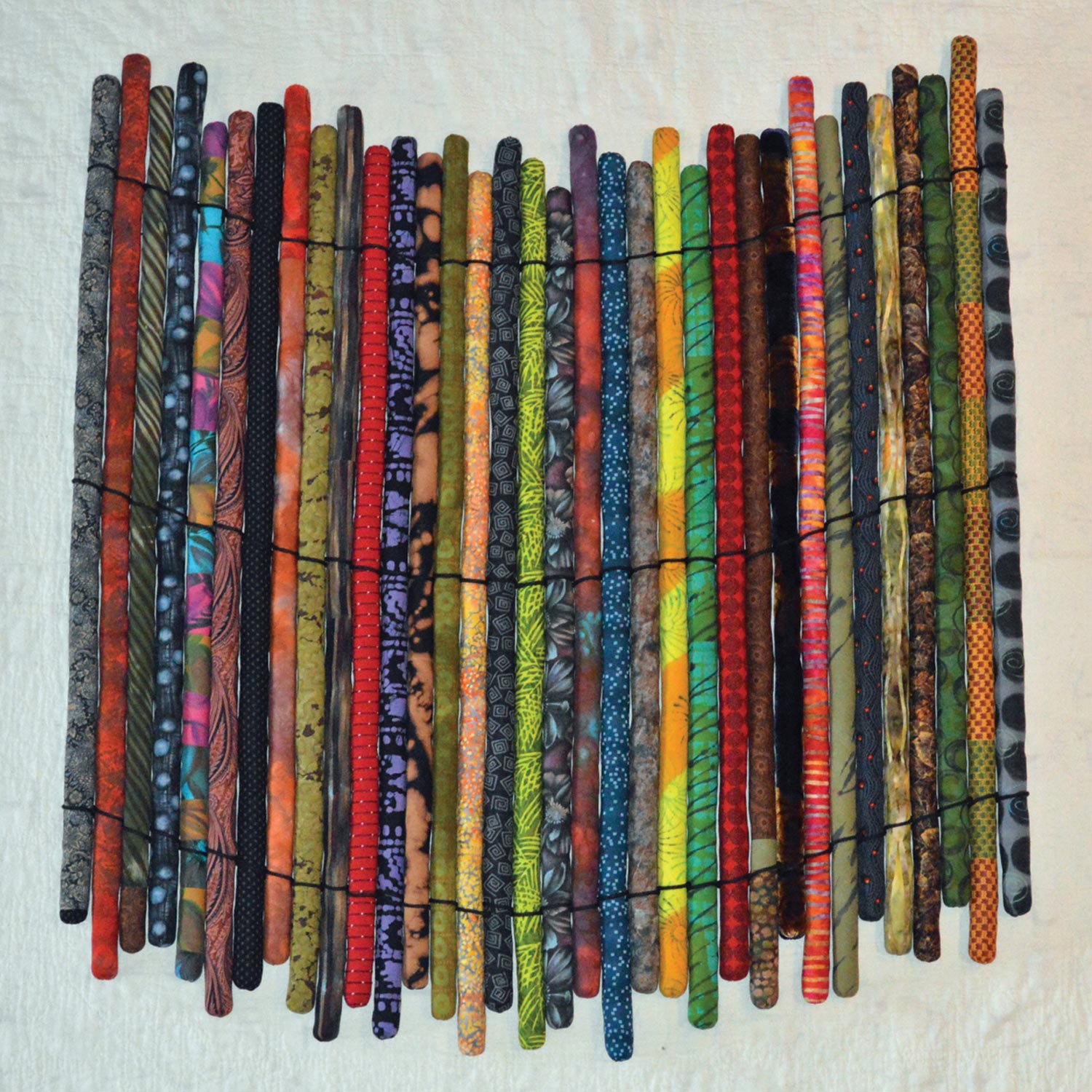Materials/Techniques: Shelly created hand-dyed, shibori dyed, hand painted, and bleach discharged cotton fabric for this piece. The work also incorporates commercial cotton print fabric, vintage cotton print fabric, and floral silk velvet fabric. The tubes were machine pieced. Each tube was stuffed with polyester batting and hand stitched close. Black cotton cord was woven around the tubes to tie them together. Hand stitches were used to secure the tubes to each other.