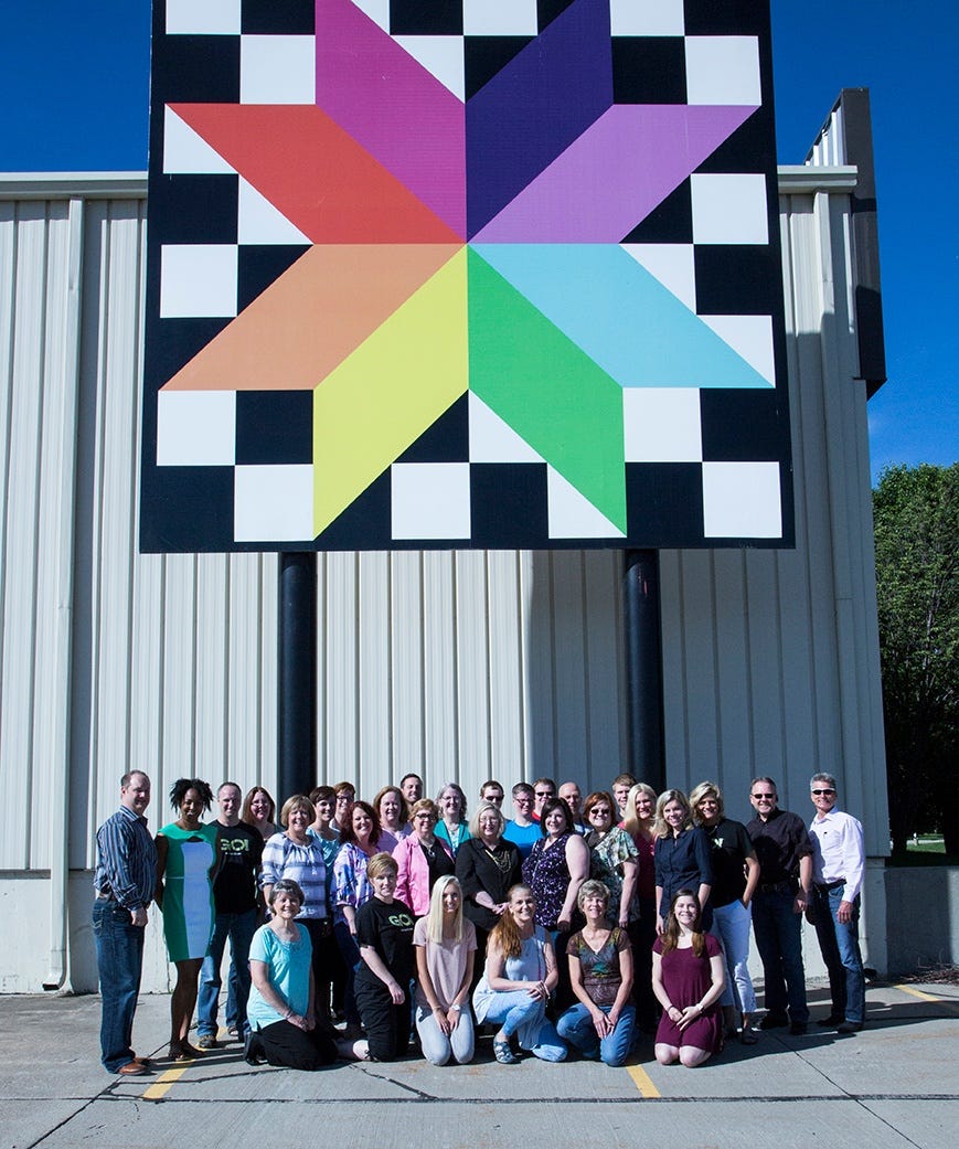 This is the biggest event of the year at AccuQuilt and the excitement among the staff is building. They recently got together to have a picture taken with the winning block of 2015 which was made by Sherry Rose before it is replaced with the 2016 winner.