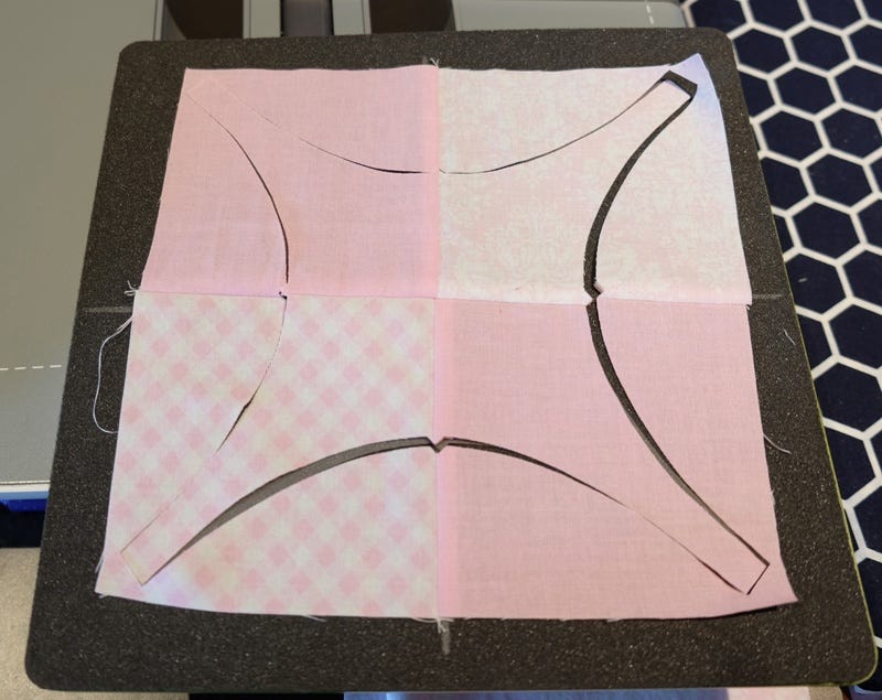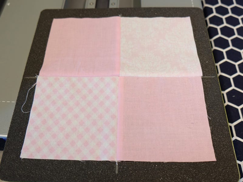 Then I laid out the four patch and lines up the seams with those lines and cut it out. You can lay two layers right side together as long as you watch for the seams lining up right.