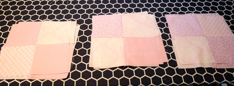 Then I sewed them into four patches, 4 of one set, 8 of the second set and 4 of the last set.