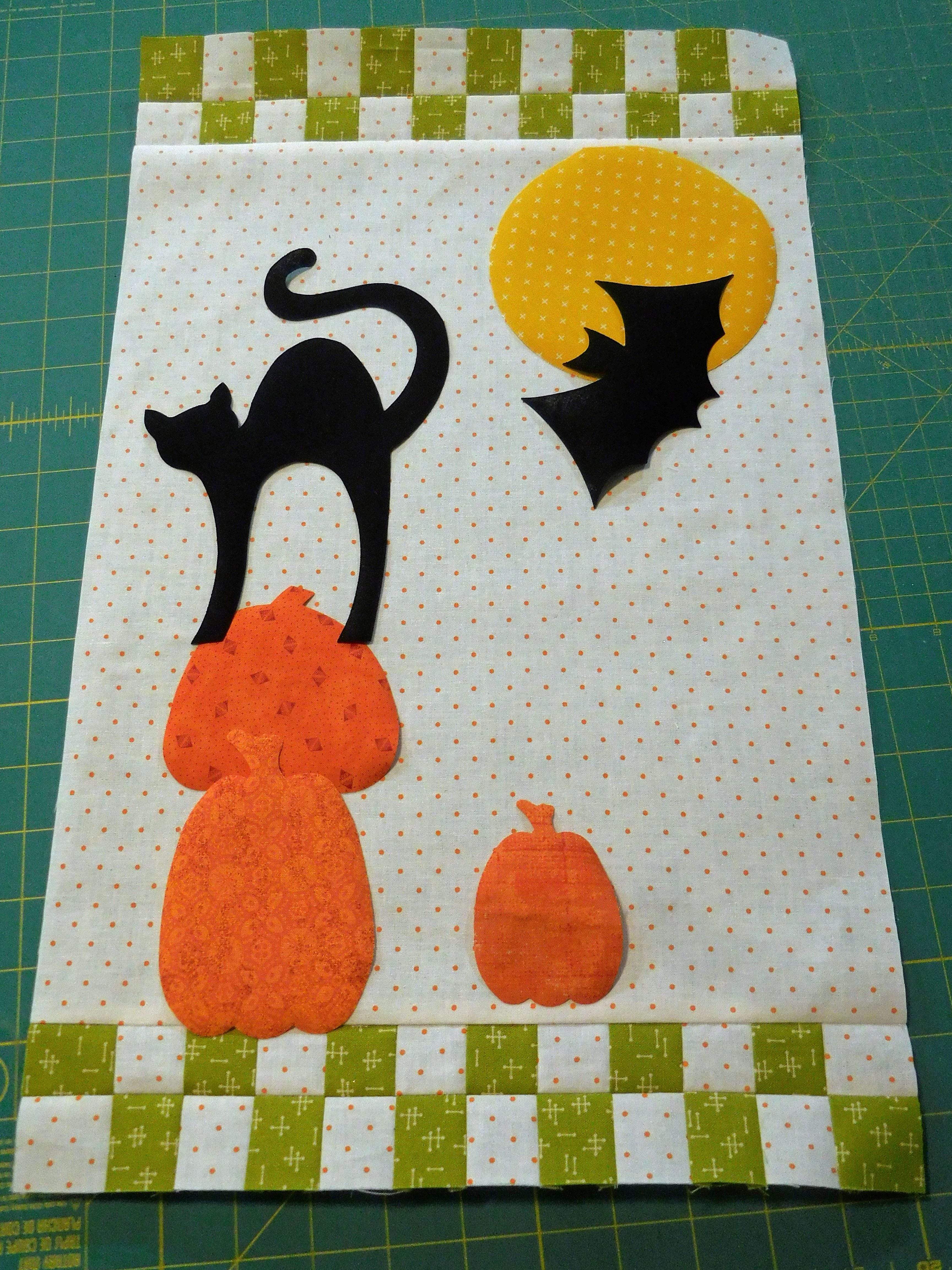 Choose your favorite way to applique, machine or by hand. AccuQuilt has free downloads of many appliques if you own an embroidery machine. I do not have access to an embroidery machine so I use a zigzag on my domestic sewing machine. Position the die cuts where you want them…
