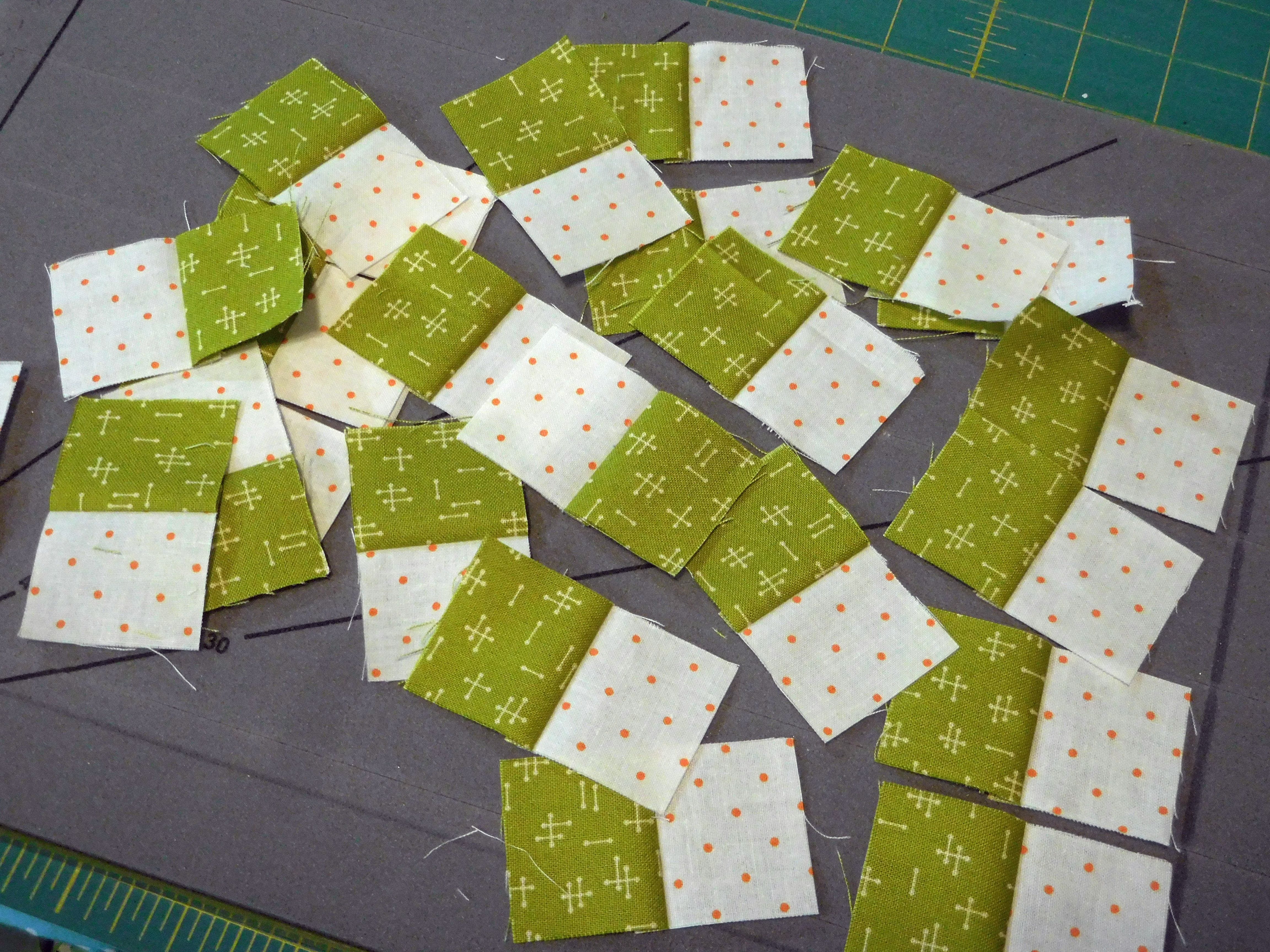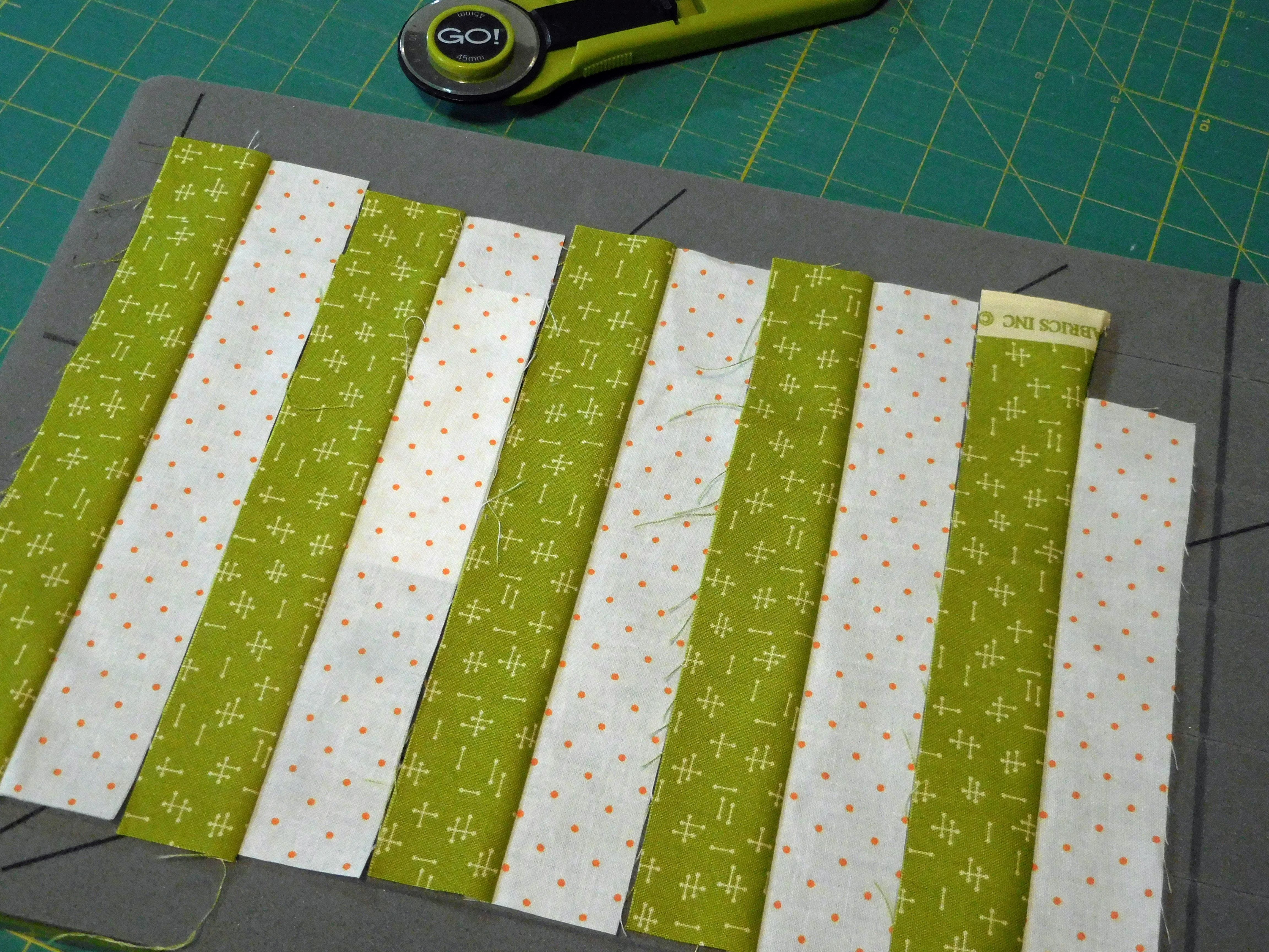 Make a strip set by sewing together one of the green and and one of the background 1 ½” strips. Cut that set into 8” segments and lay on the 1 ½” strip die as shown in this photo.