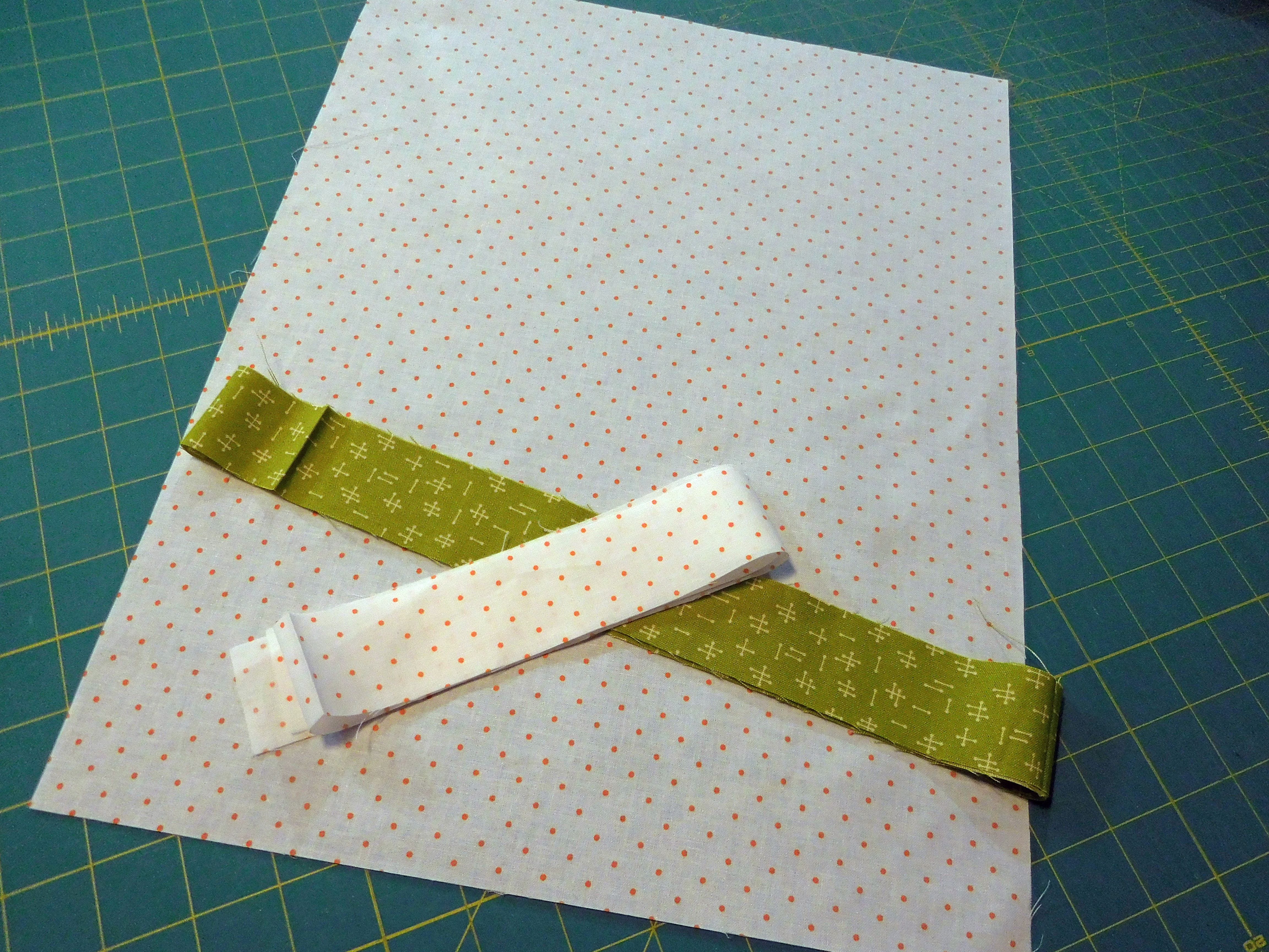 Cut one strip of green fabric and one strip of background fabric width of fabric (WOF) x 1 ½” using your GO! Strip Cutter-1 1/2" (1" Finished).