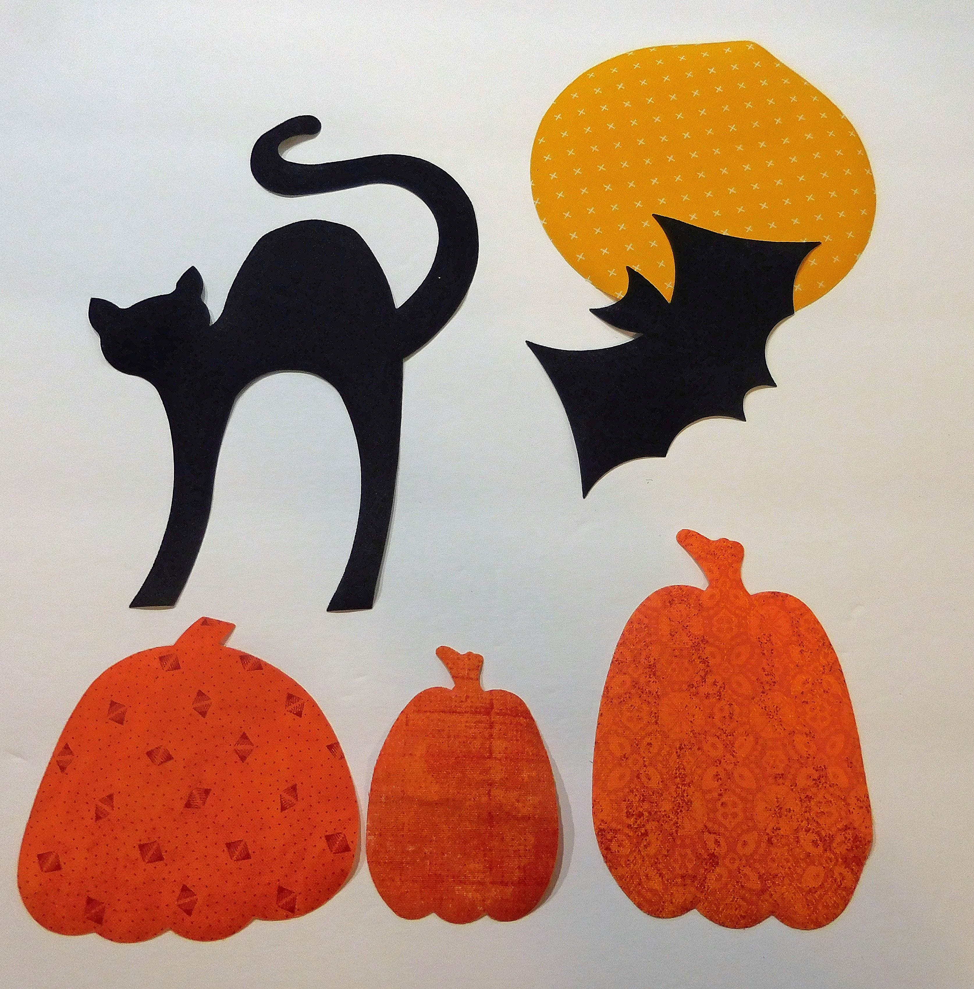 Using fusible web of your choice, follow manufacturer's instructions to apply it to the wrong side of your black, orange and gold fabrics. Then place your fabrics on the die. NOTE: be sure to decide which direction you want your cat facing before cutting. The photo below shows you what you need to cut. I used the 5” circle for the moon.