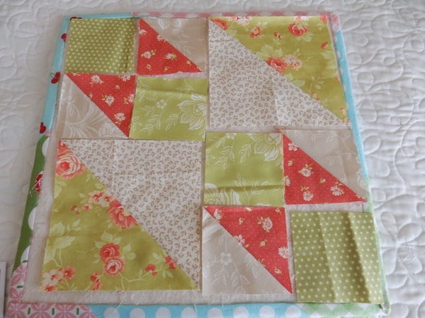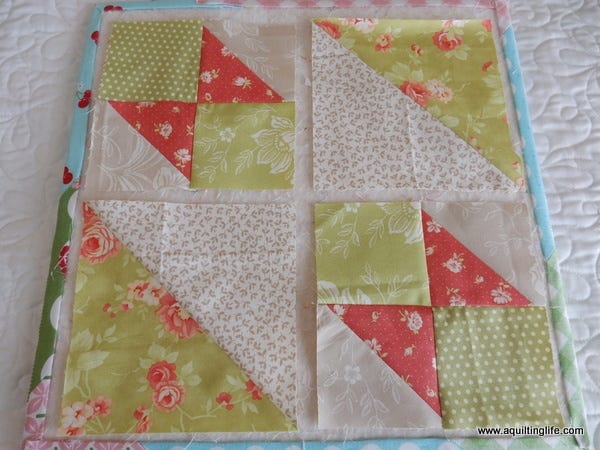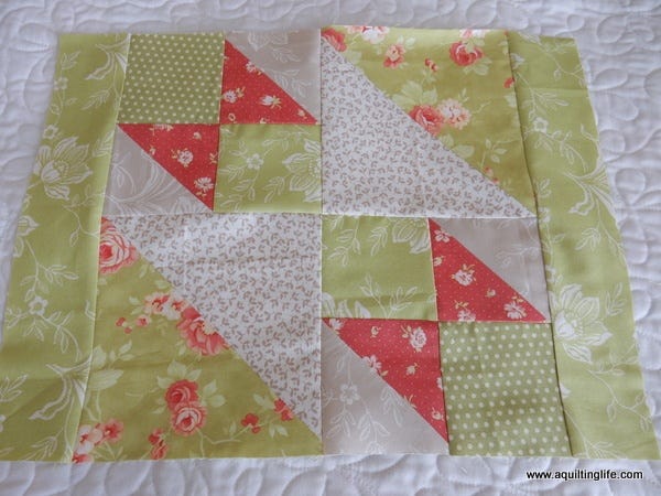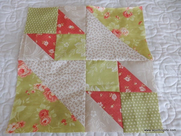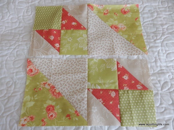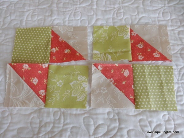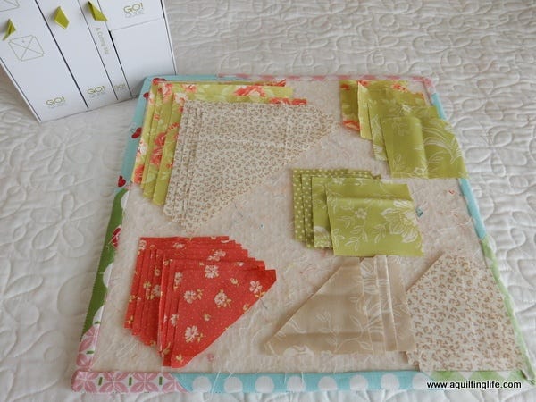 Lay out all of the pieces according to the GO! Old Maid's Puzzle Pattern included with the set. This block design reminds me of butterflies ... perfect for spring! Now you are ready to sew the small half-square triangle units together with the squares.