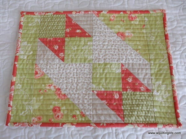 Now layer the 16" x 20 placemat backing fabric, the 16" x 20" batting, and the completed placemat top. Quilt as desired. I quilted my placemats using my walking foot and a straight stitch with the quilting lines about 1/2" apart. I also lengthened the stitch to 3.5, so the stitches would be more spaced. The simple straight line quilting really accentuated the design of the block; however, curves or stipples would be a fun choice of quilting design as well.