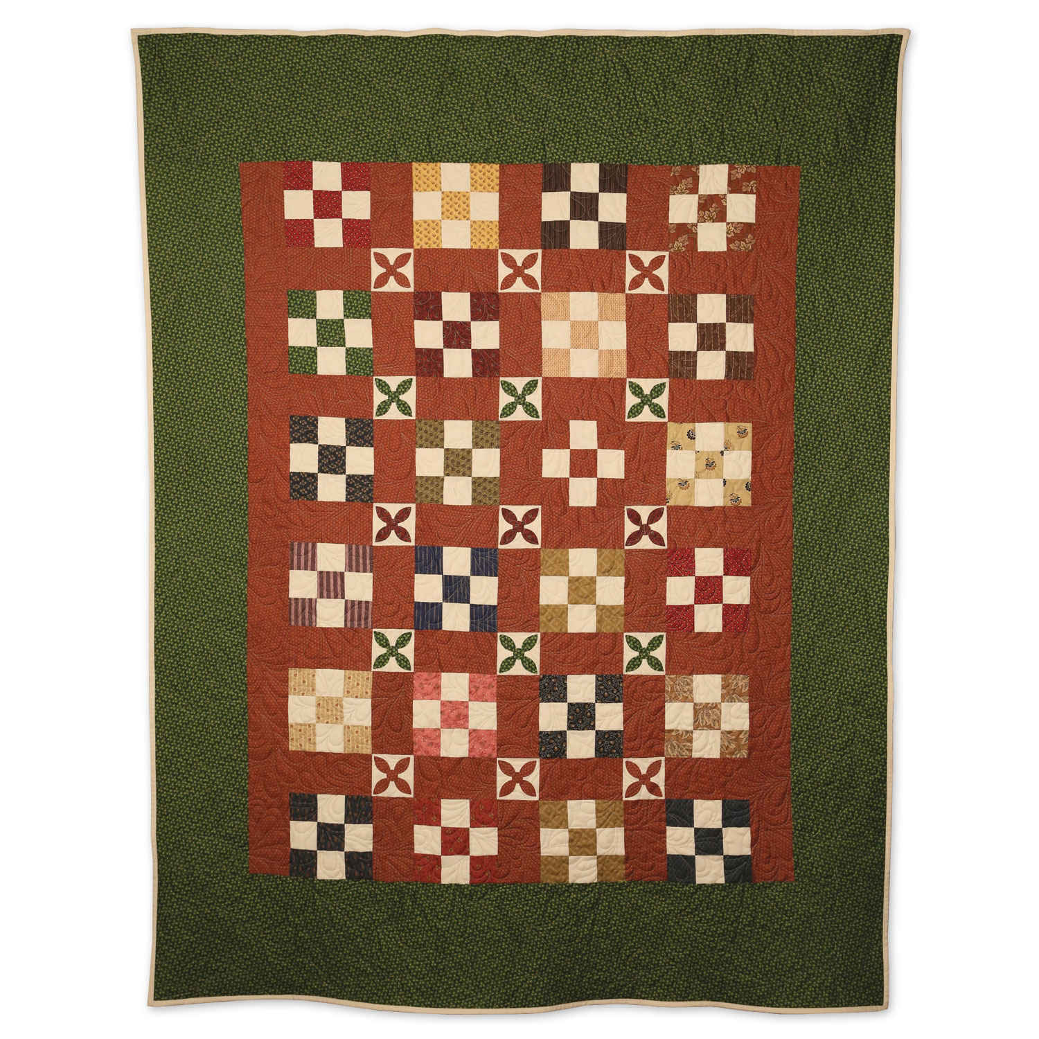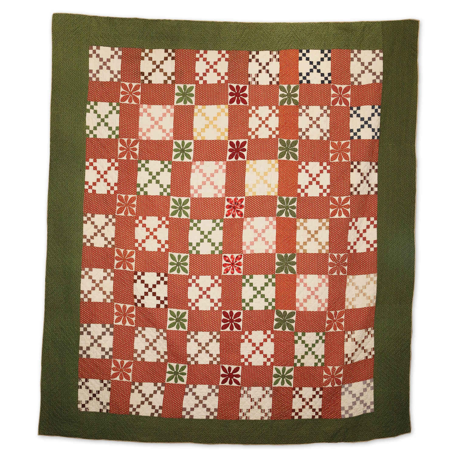 This quilt was found in the Pennsylvania area and carries the colors one would expect from that area. The typical Irish chain block is made unique with the appliqué flower petals.