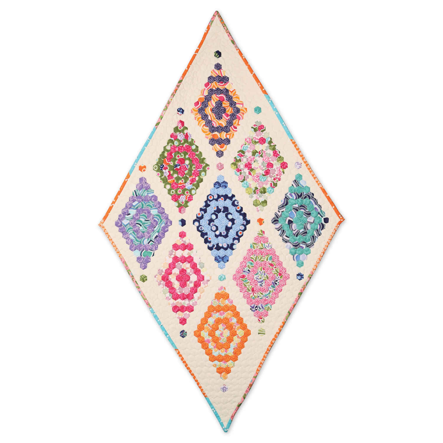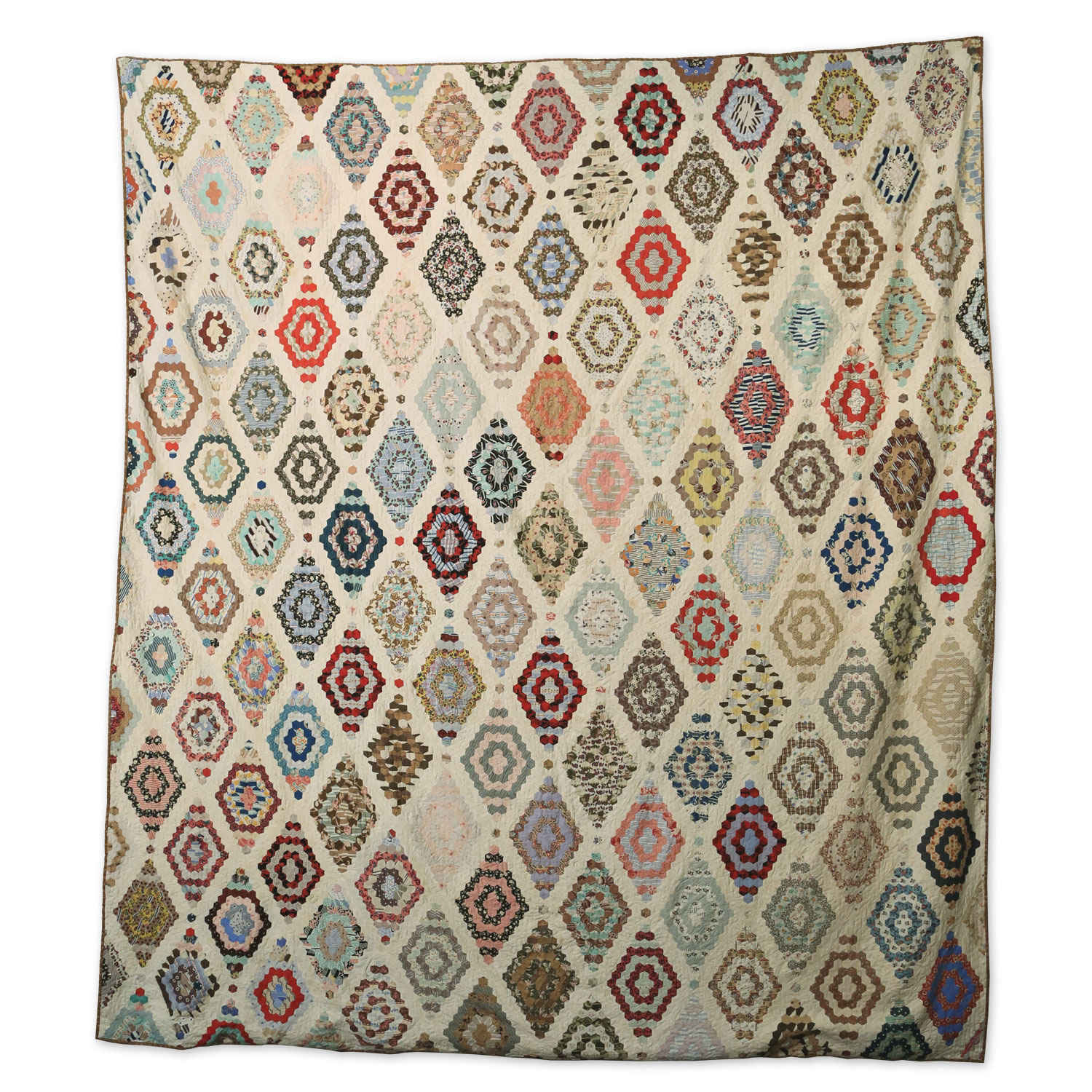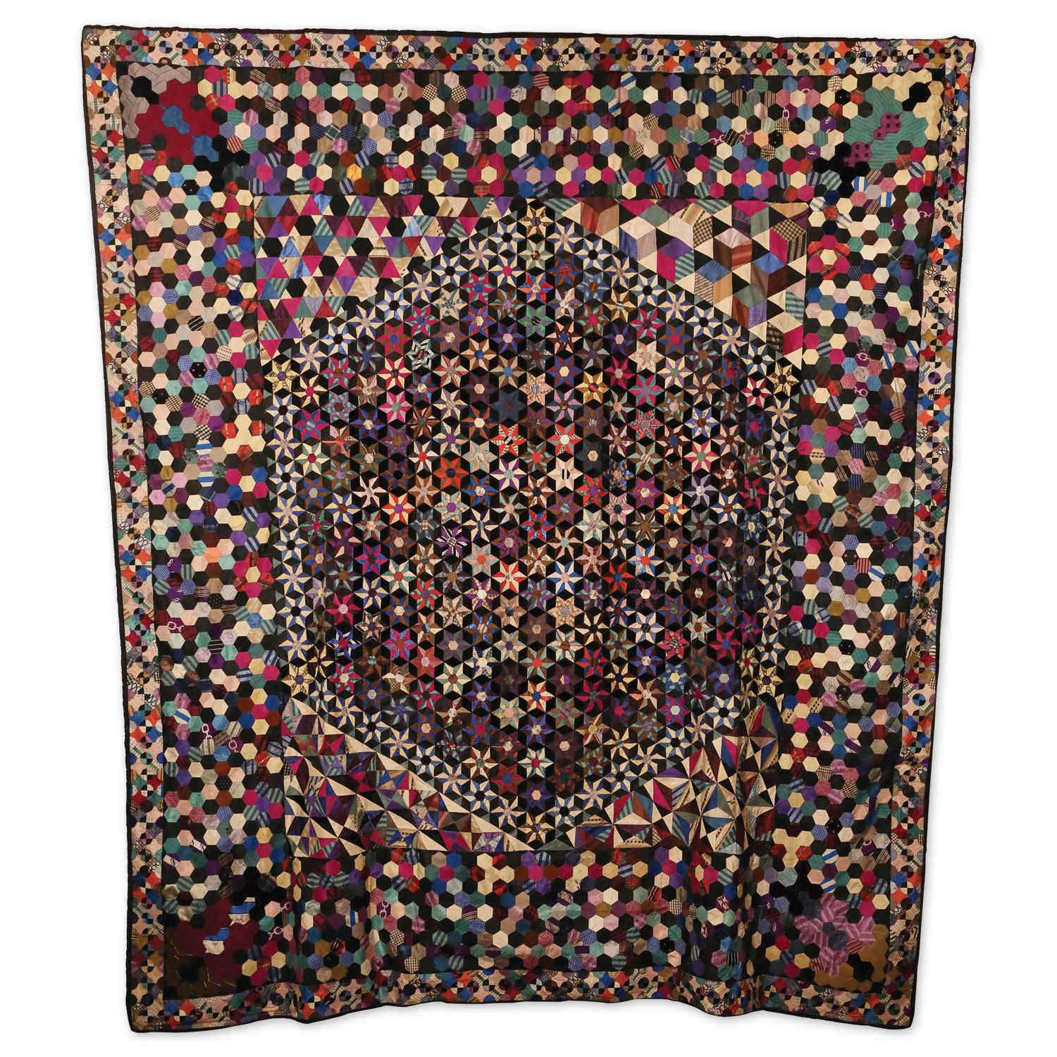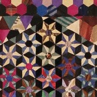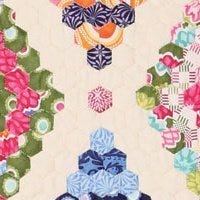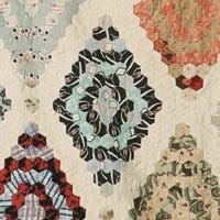 Mosaic paper piecing dates back to the late 1700’s. This lovely English quilt shows one of the various ways small hexagons can be arranged. This is not your 1930’s grandmother’s flower garden!