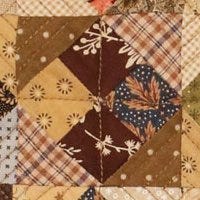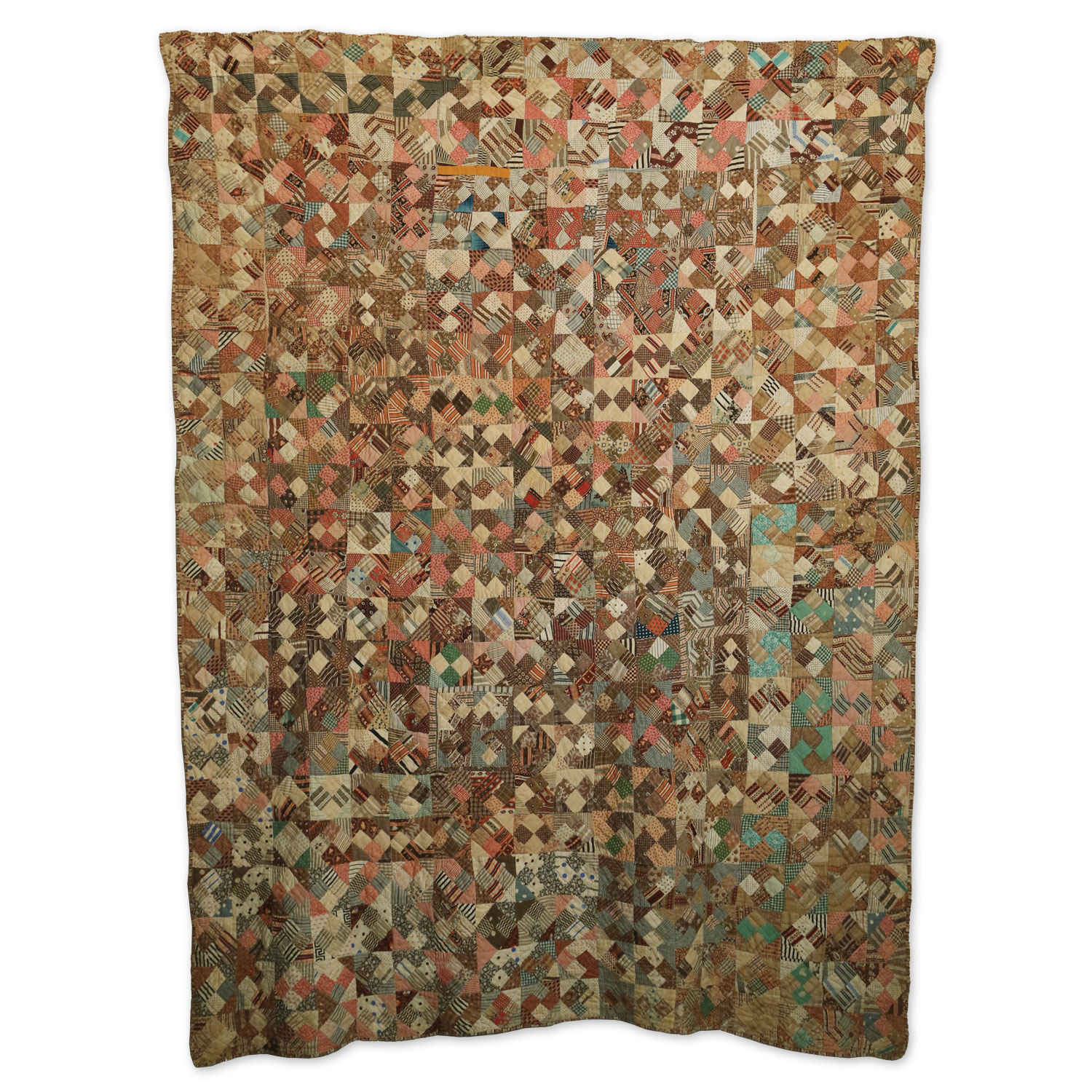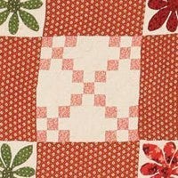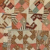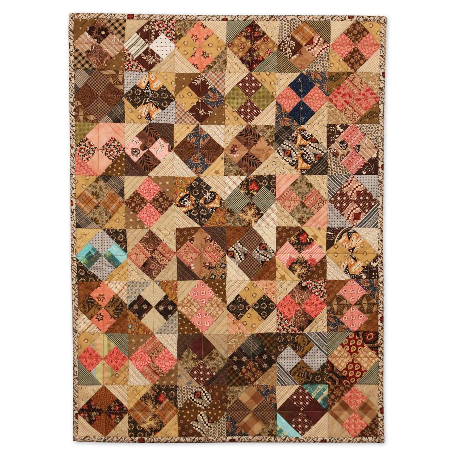 Predominately pink and brown color pattern with other fabric scraps. This four-patch is adorned with quarter squares to produce a Jack-in-the-Box middle block as it is quilted.