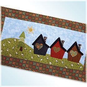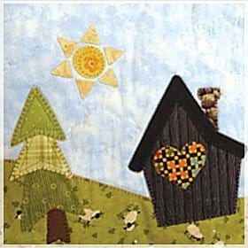 Barn Quilts were my inspiration for this mini-quilt. For my little houses, I used the wood panel fabric and the quilt fabric from the Coming Home fabric line for my petite Barn Quilts. I was thinking the tiny triangles for the sun would be too small to work with but they worked out fine. For my appliqué, I used Steam-A-Seam2®. Just press to the backside of the fabric before cutting with the AccuQuilt GO! Baby® Fabric Cutter and GO! Home die. I then peeled off the paper backing and arranged my appliqué pieces where I wanted them to be. I then gave it another press to secure to the background fabric. I used matching thread and a blanket stitch on my sewing machine. The grassy meadow is one of the fabrics in the Coming Home fabric line.
