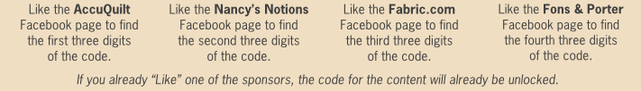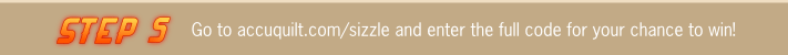 Enter by submitting the four part code from Facebook and contestant’s e-mail at www.accuquilt.com/summer-sizzle after June 1, 2012. There is no cost to register or enter.