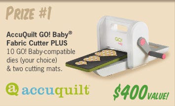 One (1) grand prize winner will be selected by AccuQuilt’s management from among all eligible entries received, on or before midnight June 11, 2012, under the supervision of TEK Industries dba AccuQuilt (“Sponsor”). Sponsors shall be defined herein as TEK Industries dba AccuQuilt, Fons & Porter, Fabric.com and Nancy’s Notions. The winner will be notified by e-mail. Prize winners will either receive an AccuQuilt GO! Baby® Fabric Cutter PLUS 10 GO! Baby-compatible dies (your choice) & two cutting mats valued at $400, Nancy’s Notions Quilters Embroidery Collection valued at $439, Fabric.com $500 Gift Certificate, or a Fons & Porter’s Love of Quilting Quilting Prize Package valued at $557.