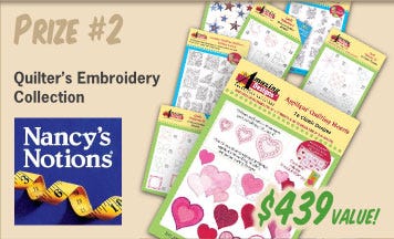 AccuQuilt, makers of the revolutionary GO! Fabric Cutter will choose four lucky winners to receive either an AccuQuilt GO! Baby® Fabric Cutter PLUS 10 GO! Baby-compatible dies (your choice) & two cutting mats valued at $400, Nancy’s Notions Quilters Embroidery Collection valued at $439, Fabric.com $500 Gift Certificate, or a Fons & Porter’s Love of Quilting Quilting Prize Package valued at $557.